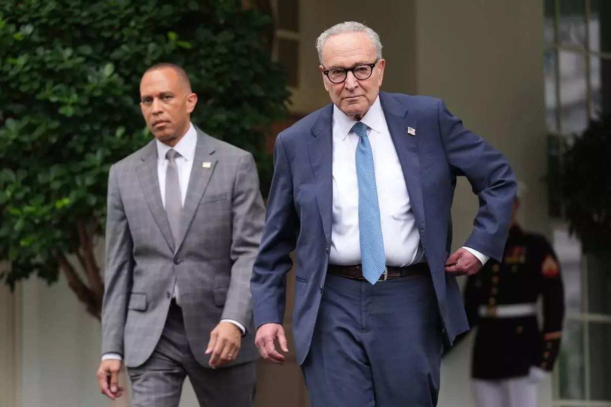 Senate Minority Leader Chuck Schumer, D-N.Y., right, and House Minority Leader Hakeem Jeffries, D-N.Y., walk speak to members of the media outside the West Wing at the White House in Washington, Monday, Sept. 29, 2025, in Washington. (AP Photo/Evan Vucci)