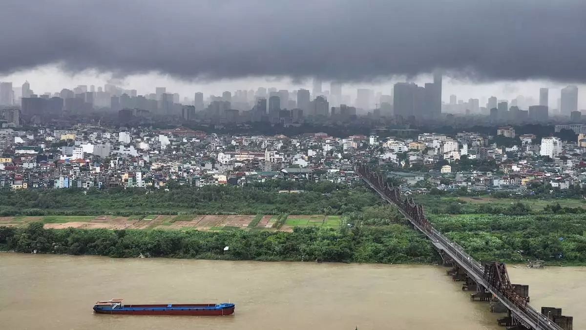 Dark clouds hang over the Hanoi skyline and the Red River after Typhoon Bualoi swept across the country, in Hanoi, Vietnam, Monday, Sept. 29, 2025. (AP Photo/Dan Dockery)