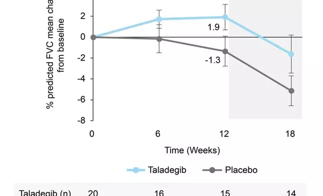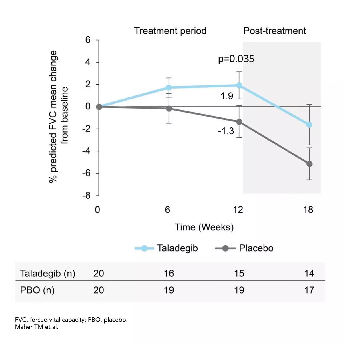 The between-group difference from baseline to week 12 in percent predicted forced vital capacity (FVC) significantly favored taladegib (3.95%; 95% confidence interval [CI], 0.31% to 7.60%; p=0.035) with a mean change from baseline of 1.9% in the taladegib arm vs -1.3% for placebo.