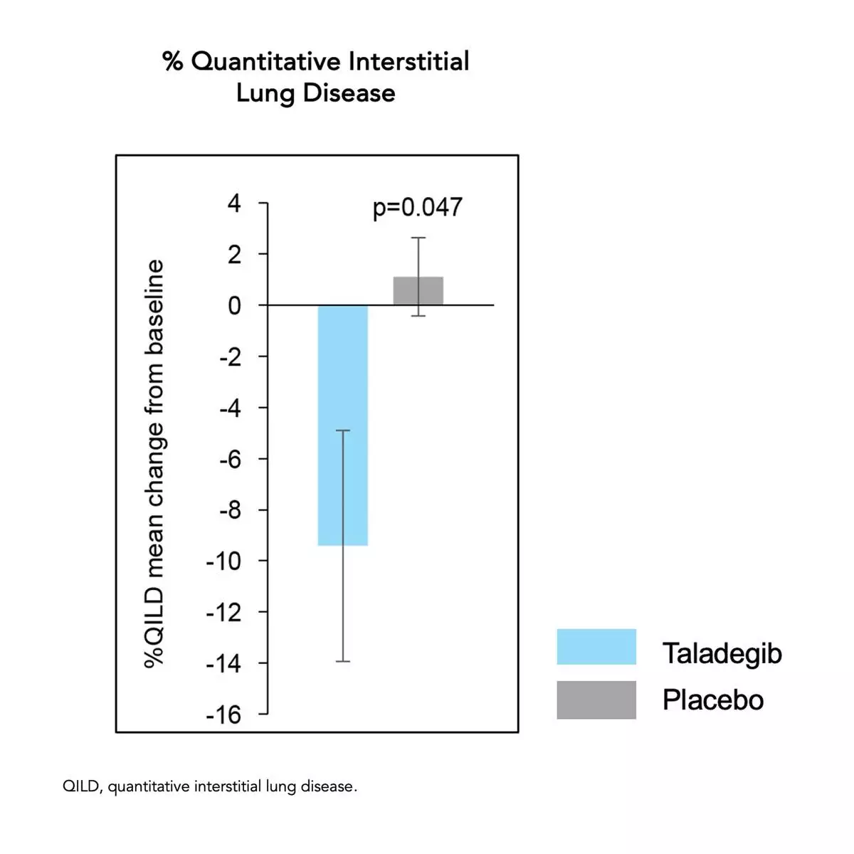 An improvement from baseline to week 12 was also seen for %QILD for the taladegib group but not for the placebo group, and there was a significant between-group difference in change from baseline to week 12 (p=0.047) with mean change from baseline of -9.4% and 1.1% in the taladegib and placebo groups, respectively.