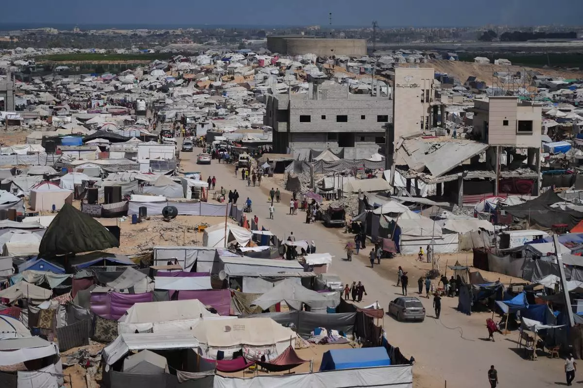 Displaced Palestinians walk through a tent camp in Muwasi, an area that Israel has designated as a safe zone, in Khan Younis southern Gaza Strip, Monday, Sept. 29, 2025. (AP Photo/Jehad Alshrafi)