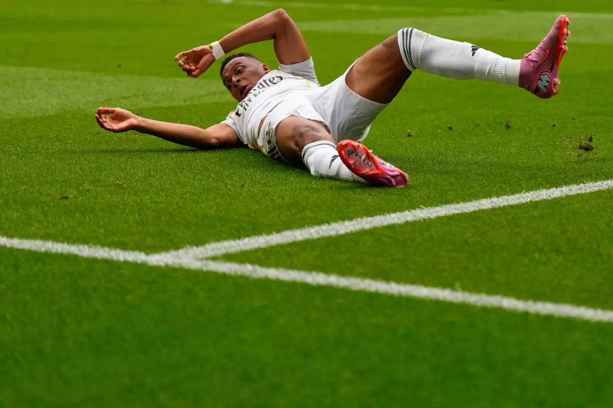 Real Madrid's Kylian Mbappe falls as he battles for the ball during the Spanish La Liga soccer match between Atletico Madrid and Real Madrid at Metropolitano stadium, in Madrid, Spain, Saturday, Sept. 27, 2025. (AP Photo/Manu Fernandez)