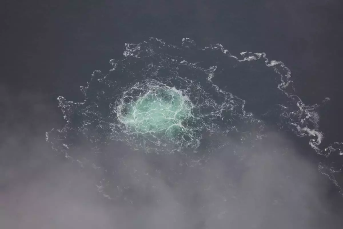 FILE - In this picture provided by Swedish Coast Guard, a leak from Nord Stream 2 is seen, on Sept. 28, 2022. (Swedish Coast Guard via AP, File)