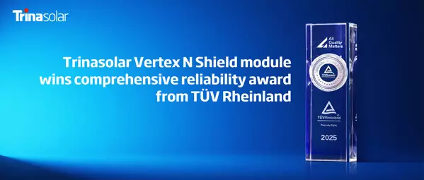 CHANGZHOU, China, Sept. 30, 2025 /PRNewswire/ -- Trinasolar announced its Vertex N Shield module has been honored with the PV module Comprehensive Reliability Award at the 11th TÜV Rheinland "All Quality Matters" Solar & ESS Congress 2025, highlighting the exceptional reliability of Trinasolar's modules.