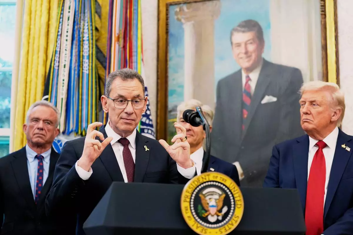 Albert Bourla, chairman and chief executive officer of the pharmaceutical company Pfizer. speaks in the Oval Office of the White House, Tuesday, Sept. 30, 2025, in Washington, as from left, Secretary of Health and Human Services Robert F. Kennedy, Jr., Mehmet Oz, Administrator for the Centers for Medicare & Medicaid Services and President Donald Trump, right, look on. (AP Photo/Alex Brandon)