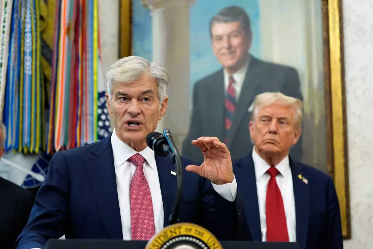 Mehmet Oz, Administrator for the Centers for Medicare & Medicaid Services speaks in the Oval Office of the White House, Tuesday, Sept. 30, 2025, in Washington, as President Donald Trump looks on. (AP Photo/Alex Brandon)