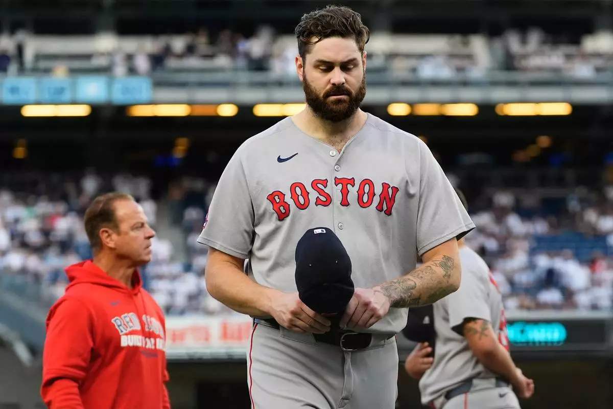 Boston Red Sox pitcher Lucas Giolito walks off the field after player introductions before Game 1 of an American League wild-card baseball playoff series against the New York Yankees, Tuesday, Sept. 30, 2025, in New York. (AP Photo/Yuki Iwamura)