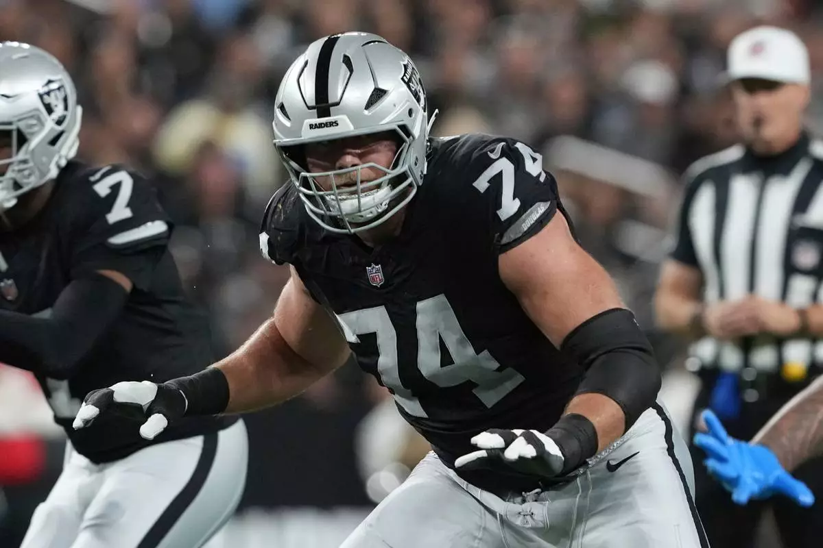 FILE - Las Vegas Raiders offensive tackle Kolton Miller (74) blocks against the Los Angeles Chargers during the first half of an NFL football game, Sept. 15, 2025, in Las Vegas. (AP Photo/Rick Scuteri)