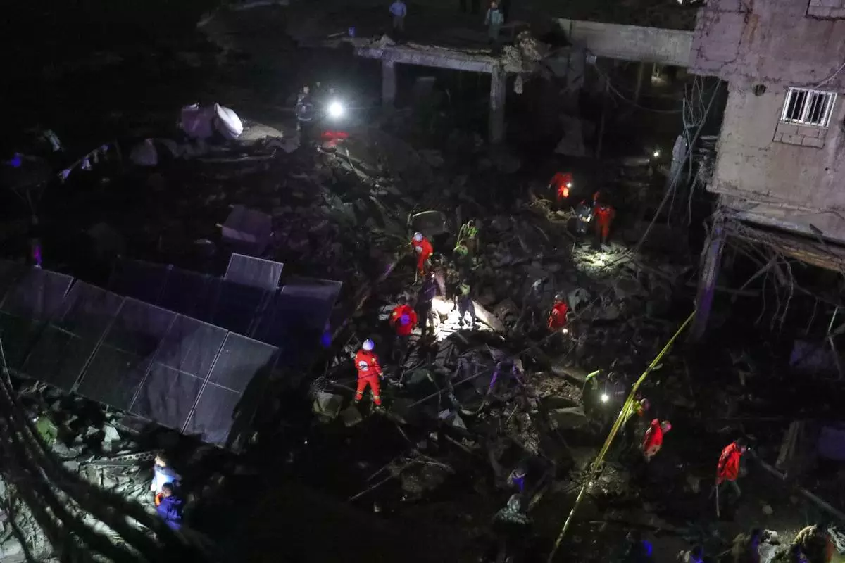 Lebanese Red Cross volunteers search for possible victims in a building destroyed by an Israeli airstrike in the southern port city of Sidon, Lebanon, early Tuesday, Jan. 6, 2026. (AP Photo/Mohammed Zaatari)