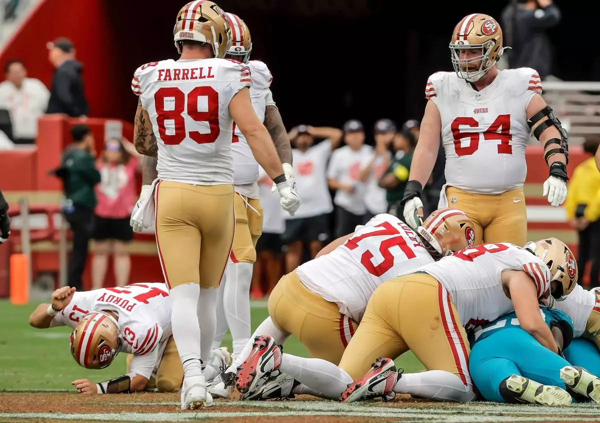 San Francisco 49ers' Brock Purdy (13), lower left, pounds his fist into the turf after his fumble in the final minutes of an NFL football game was recovered by the Jacksonville Jaguars in Santa Clara, Calif., Sunday, Sept. 28, 2025. (Carlos Avila Gonzalez/San Francisco Chronicle via AP)