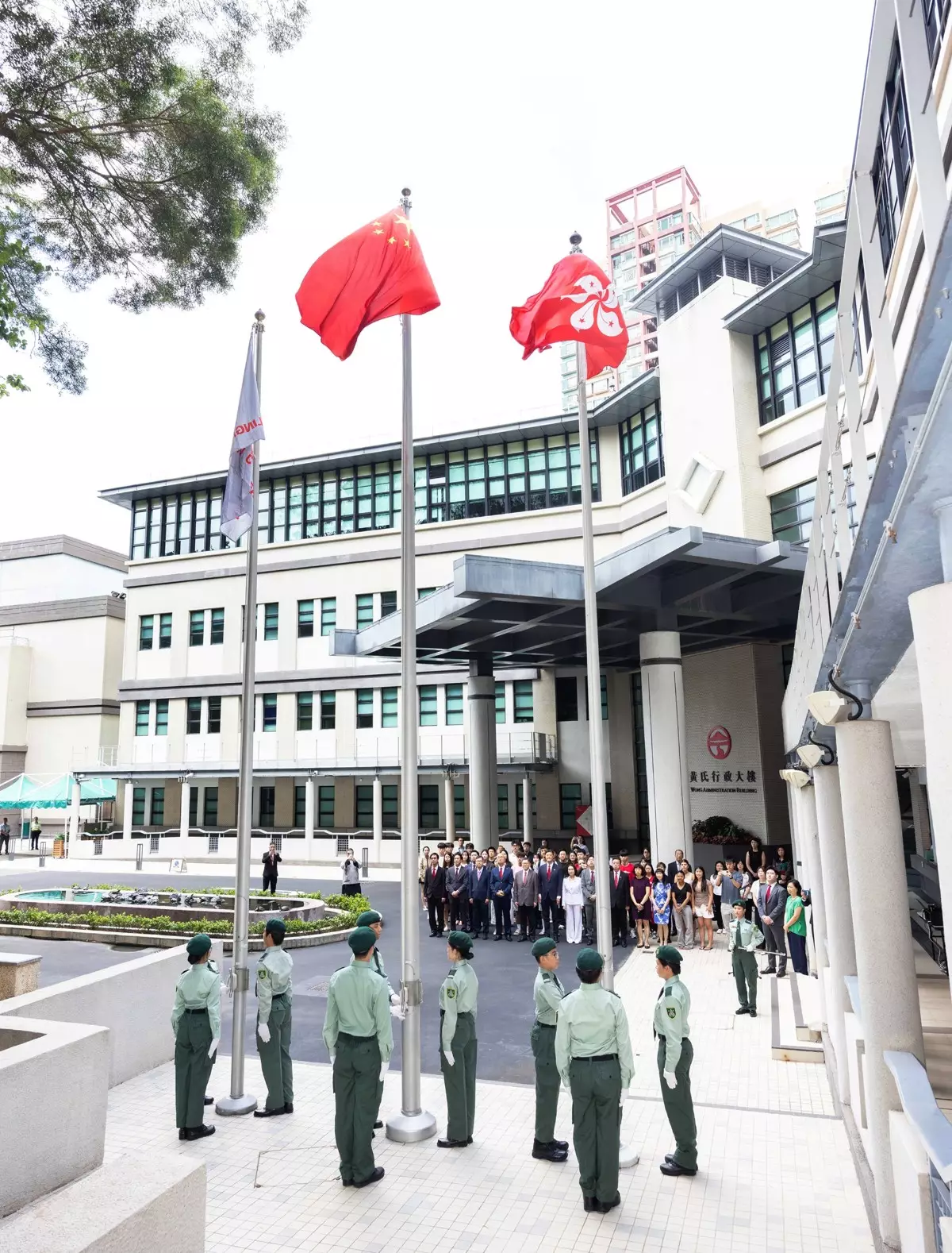 The Lingnan University Flag Guard Team raised the national flag of the People's Republic of China alongside the flags of the Hong Kong Special Administrative Region and Lingnan University as the national anthem was played.