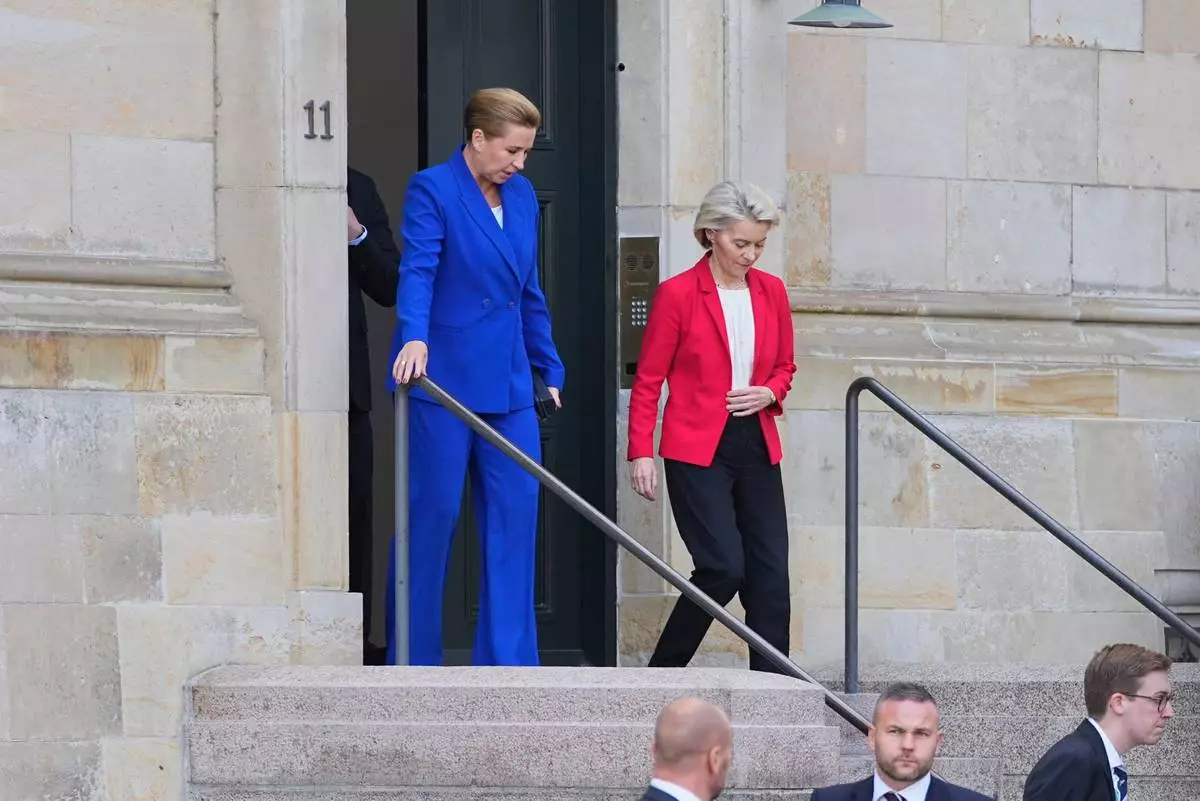 Denmark's Prime Minister Mette Frederiksen, left, and President of the European Commission, Ursula von der Leyen leave the Prime Minister's office in the Danish Parliament at Christiansborg Castle in Copenhagen, on Wednesday, Oct. 1, 2025. (Thomas Traasdahl/Ritzau Scanpix via AP)