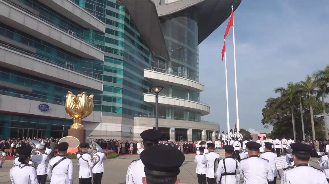 China's Hong Kong Special Administrative Region (HKSAR) held a flag-raising ceremony on the National Day, which falls on Wednesday this year, to celebrate the 76th anniversary of the founding of the People's Republic of China.