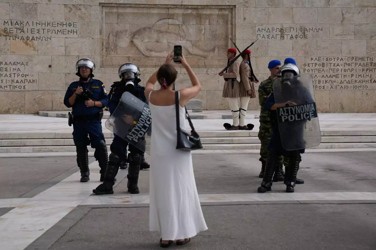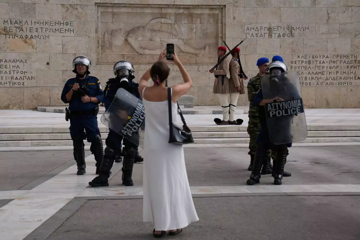 A woman takes a snapshot at the Greek parliament as Greek police stand guard near a protest during a nationwide 24-hour strike in Athens, Greece, Wednesday, Oct. 1, 2025. (AP Photo/Petros Giannakouris)