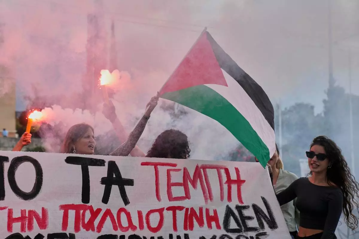 Protesters with flares wave a Palestinian flag during a nationwide 24-hour strike, as labor unions demand higher wages and the withdrawal of a bill that changes work hours Wednesday, Oct. 1, 2025. (AP Photo/Petros Giannakouris)