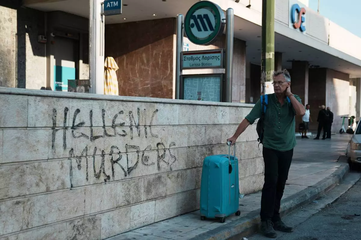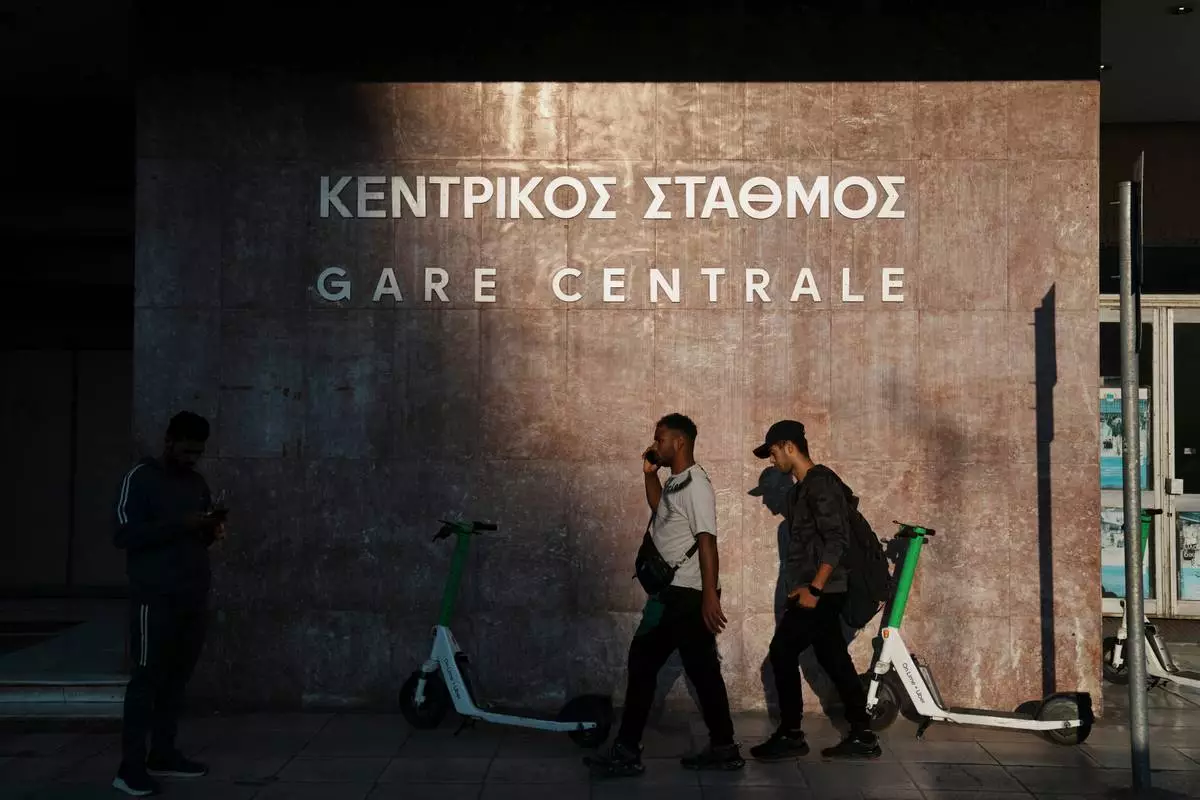 People walk outside the closed main railway station during a nationwide 24-hour strike, as labor demand higher wages and the withdrawal of a bill that changes work hours in Athens, Greece, Wednesday, Oct. 1, 2025. (AP Photo/Thanassis Stavrakis)