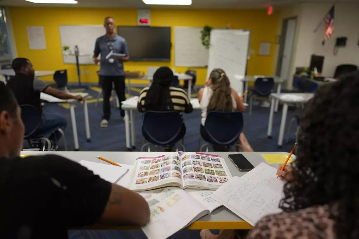 Immigrants trying to learn the English language take notes as Eliezer Guerrero of Catholic Charities of Central Florida teaches an ESOL class, Tuesday, Aug. 19, 2025, in Orlando, Fla. (AP Photo/Rebecca Blackwell)