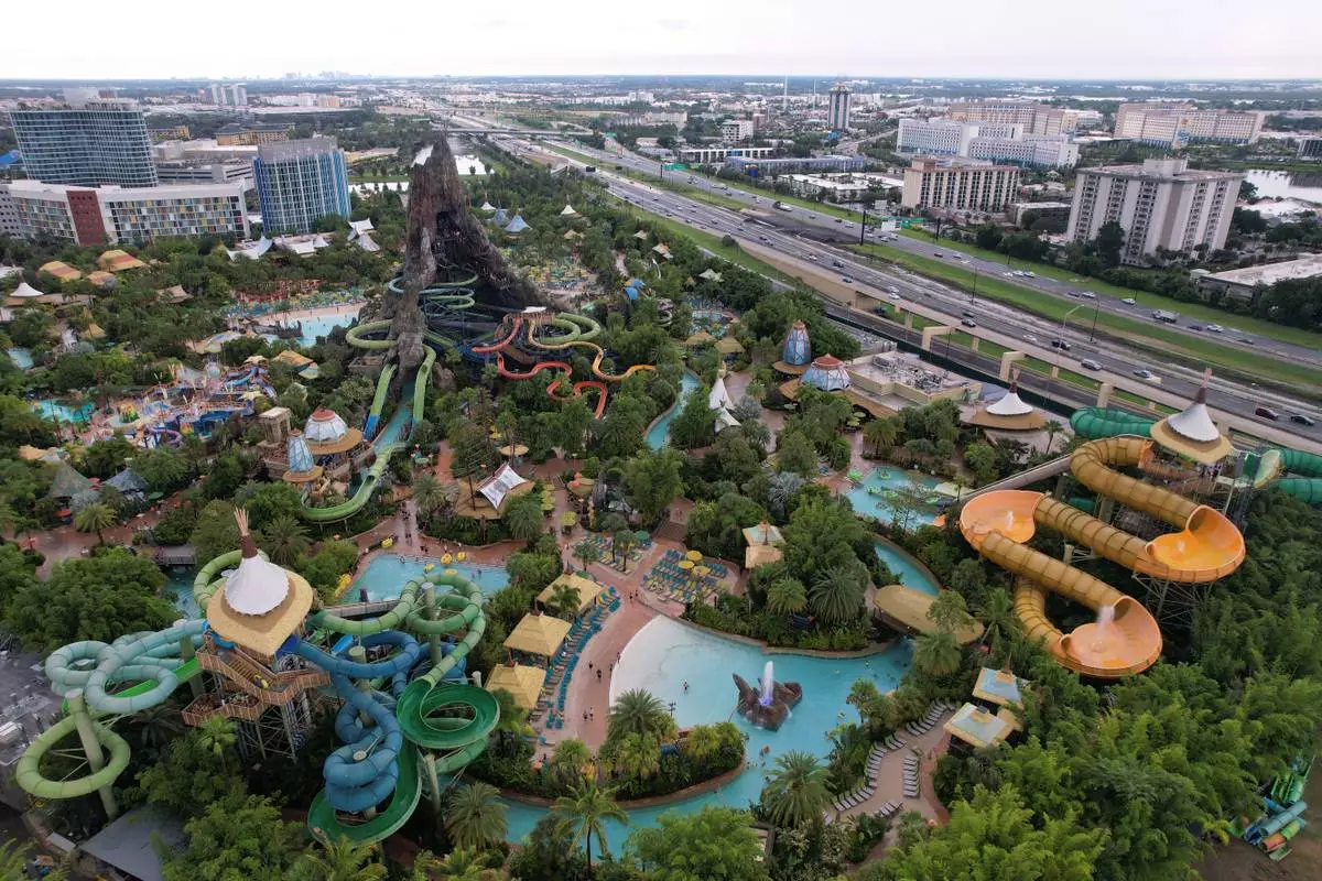 Hotels and highways are seen around Universal Volcano Bay water park, Friday, Aug. 22, 2025, in Orlando, Fla., which saw an influx of migrants in recent years drawn by warm temperatures, a vibrant migrant community, and plentiful job opportunities. (AP Photo/Rebecca Blackwell)