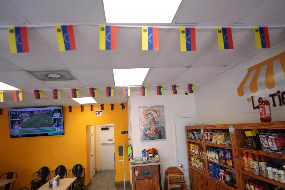 Venezuelan flags hang inside TeqaBite, a restaurant co-owned by two U.S. citizens born in Venezuela, in Kissimmee, Fla., Thursday, Aug. 21, 2025. (AP Photo/Rebecca Blackwell)