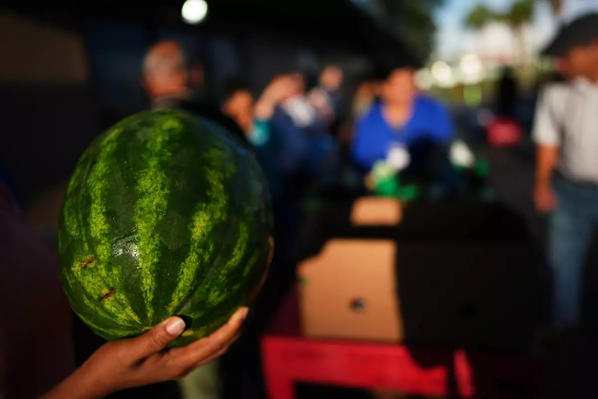 Watermelons are handed out to people waiting in line at a food pantry which provides assistance to anyone in need, including some migrants who have had their legal protections and work permits terminated, Friday, Aug. 22, 2025, in Orlando, Fla. (AP Photo/Rebecca Blackwell)