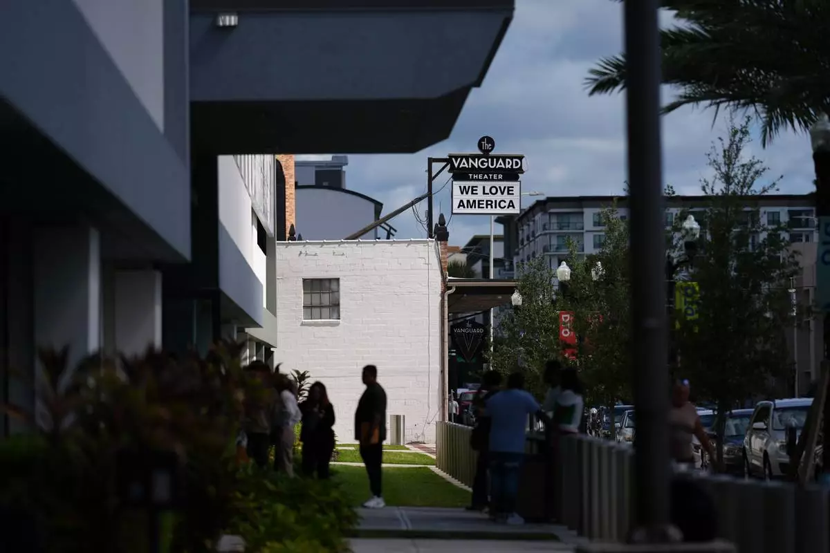 A theater marquee reads "We Love America," alongside the federal government building which houses the Orlando Immigration Court and the Social Security Administration office, in downtown Orlando, Fla., Wednesday, Aug. 20, 2025. (AP Photo/Rebecca Blackwell)