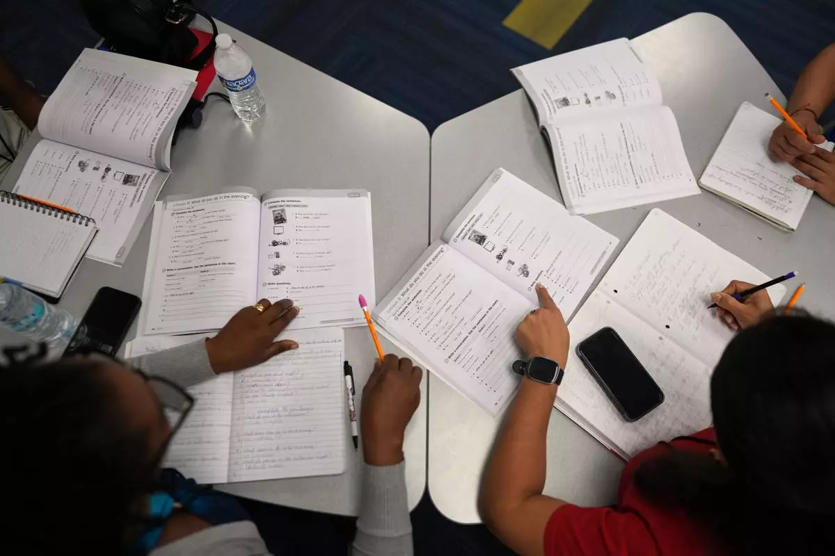 Immigrants trying to learn the English language do a workbook exercise as they participate in ESOL class offered by Catholic Charities of Central Florida, Tuesday, Aug. 19, 2025, in Orlando, Fla. (AP Photo/Rebecca Blackwell)