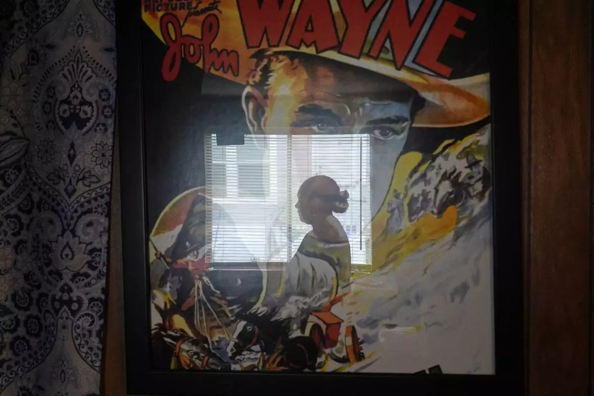 Paola Freites, who asked to be identified by her middle name and second last name to protect her family's safety, is reflected in a poster of John Wayne, who her teenaged son is a fan of, inside the two-bedroom mobile home where she lives with her husband and three children after fleeing persecution in their native Colombia, Thursday, Aug. 21, 2025, in Apopka, Fla. (AP Photo/Rebecca Blackwell)