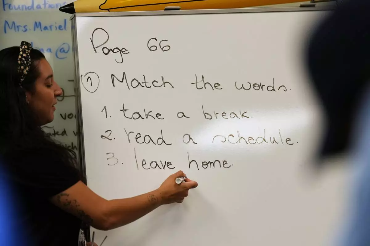 Patricia Otero writes phrases on the board as she teaches a Catholic Charities of Central Florida ESOL class to immigrants trying to learn the English language, Tuesday, Aug. 19, 2025, in Orlando, Fla. (AP Photo/Rebecca Blackwell)