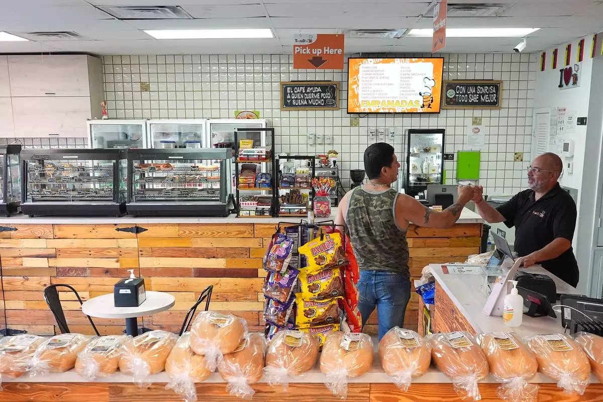 Dario Romero, right, co-owner of Venezuelan restaurant TeqaBite, greets a customer, Thursday, Aug. 21, 2025, in Kissimmee, Fla. Despite a big increase in the local Venezuelan population in the last several years, Romero says the restaurant has recently struggled to fill job openings and business is down. An immigration crackdown under President Donald Trump has led to some migrants losing their legal status and work permits, while many others still in legal processes are too fearful to venture out of the house except to go to and from work. (AP Photo/Rebecca Blackwell)