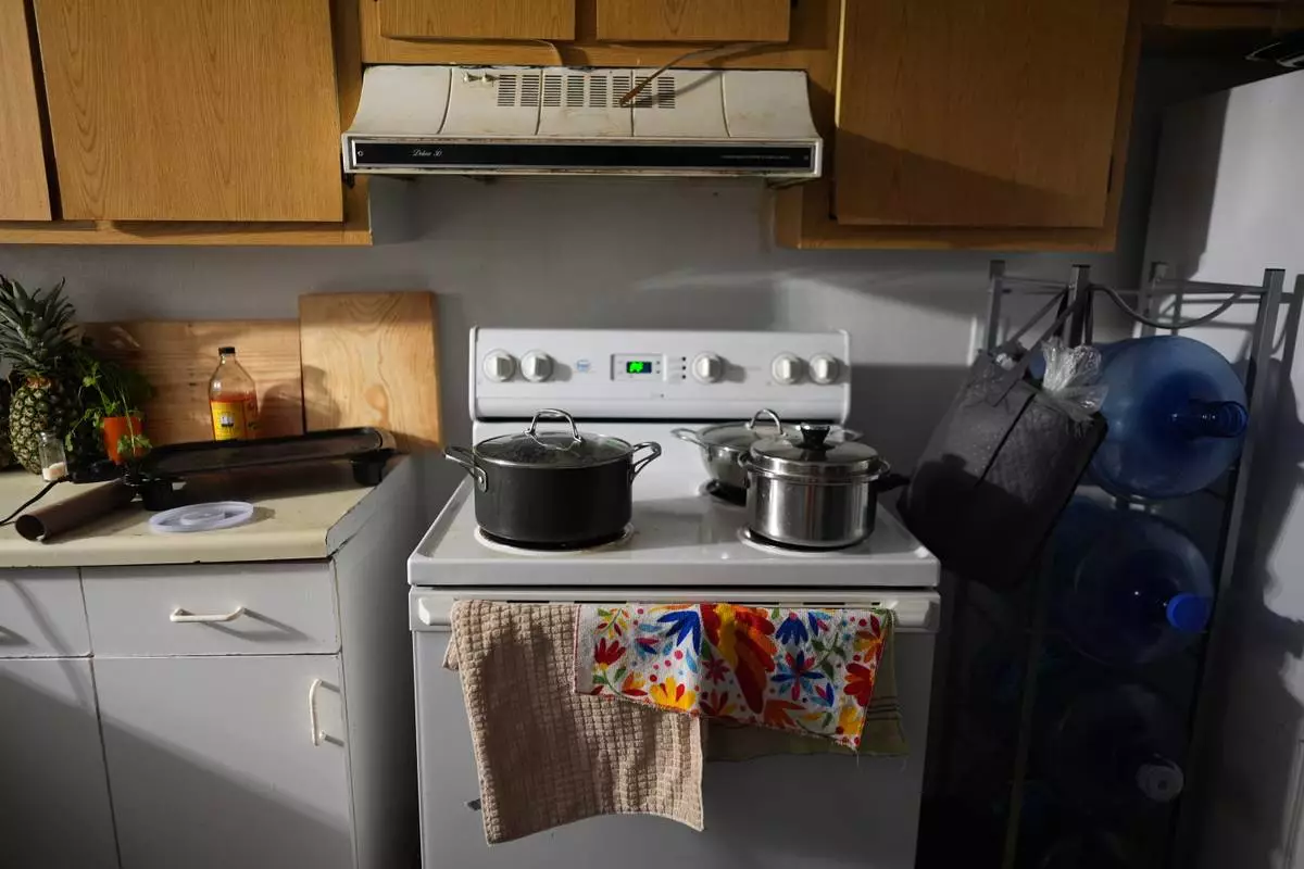 Pots containing food cooked for the family sit on top of the stove in the home of Mexican asylum seeker Blanca, Wednesday, Aug. 20, 2025, in Apopka, Fla. (AP Photo/Rebecca Blackwell)