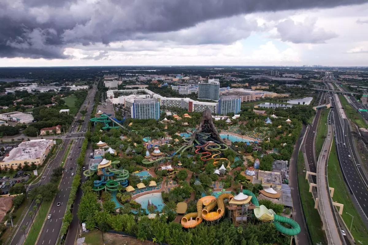 Hotels and highways are seen around Universal Volcano Bay water park, Friday, Aug. 22, 2025, in Orlando, Fla. Migrants who moved to central Florida in recent years say they were drawn by warm temperatures, a large migrant community, and the ease of finding jobs in one of the country's tourism and hospitality hotspots. (AP Photo/Rebecca Blackwell)