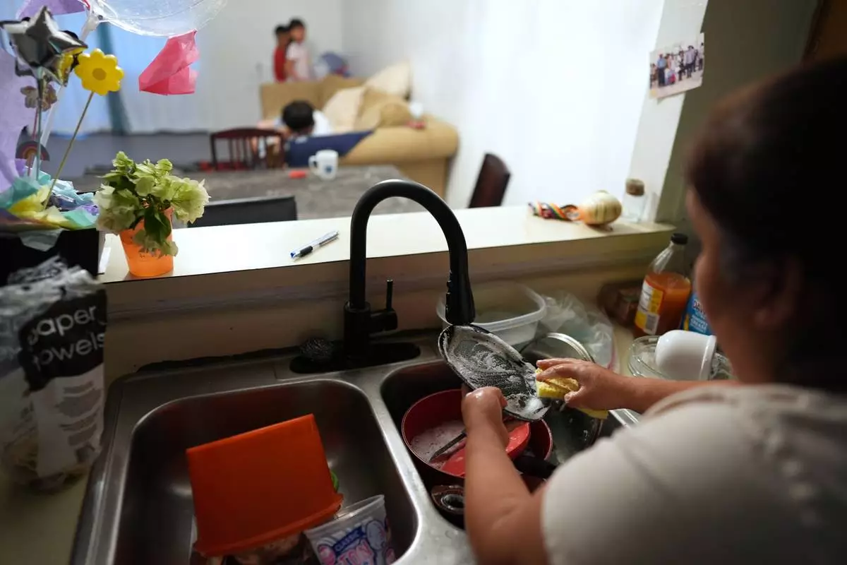 Blanca does dishes as her three children play in Apopka, Fla., Wednesday, Aug. 20, 2025. (AP Photo/Rebecca Blackwell)