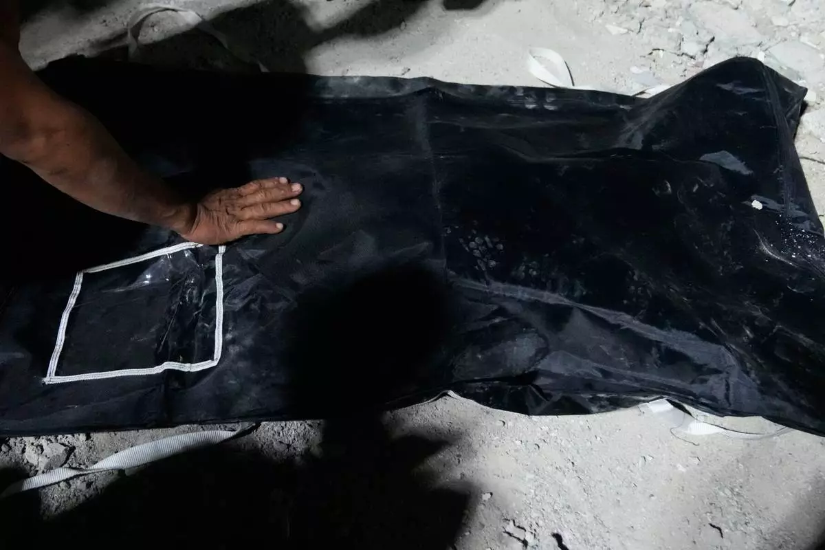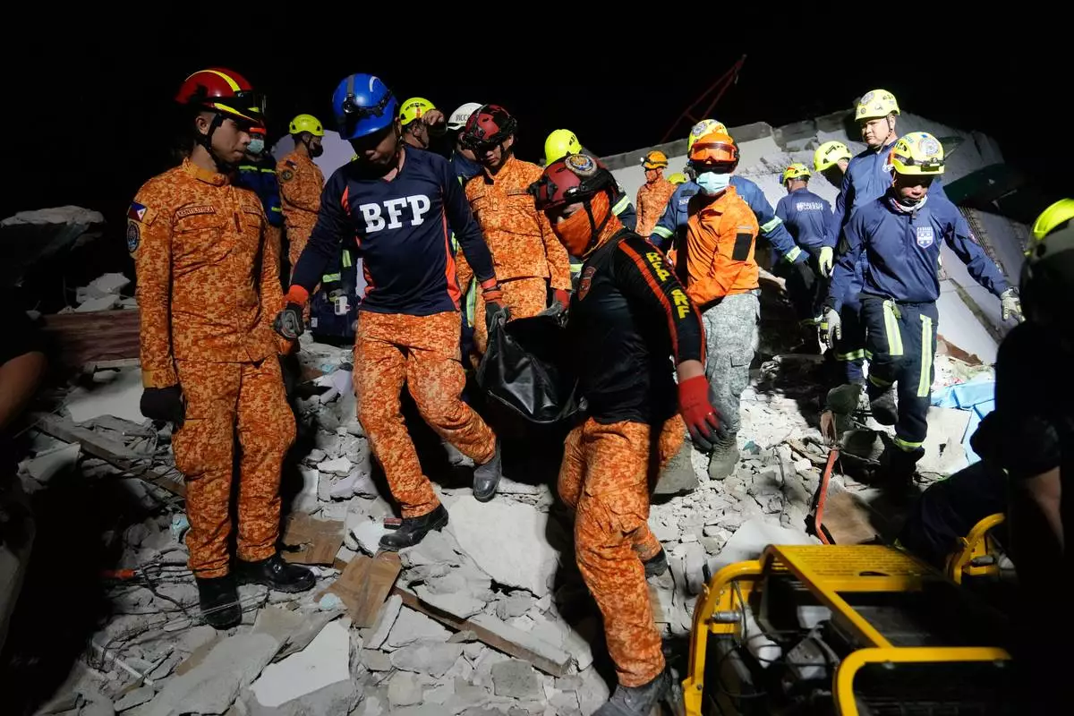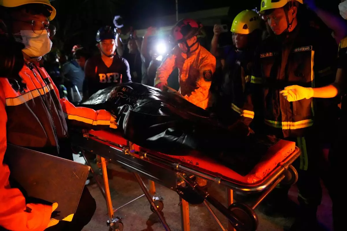 BOGO, Philippines (AP) — Rescuers check the rubble for survivors and bring out victims in body bags following a magnitude-6.9 earthquake that struck off the coast of Bogo in Cebu province, Philippines. The quake late Tuesday collapsed houses and buildings, killing dozens of people. The toll was expected to rise as rescuers reach hard-hit areas.