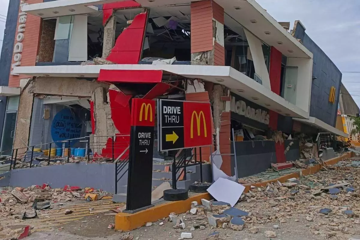 A damaged McDonald's store is seen in Bogo City, Cebu province, Philippines Wednesday, Oct. 1, 2025 after an offshore earthquake on late Tuesday. (AP Photo/Rufino Alub)