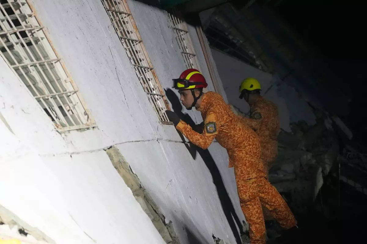 Firemen inspect outside a damaged restaurant on Thursday, Oct. 2, 2025 after Tuesday's strong earthquake in Bogo city, Cebu Province, Central Philippines. (AP Photo/Aaron Favila)