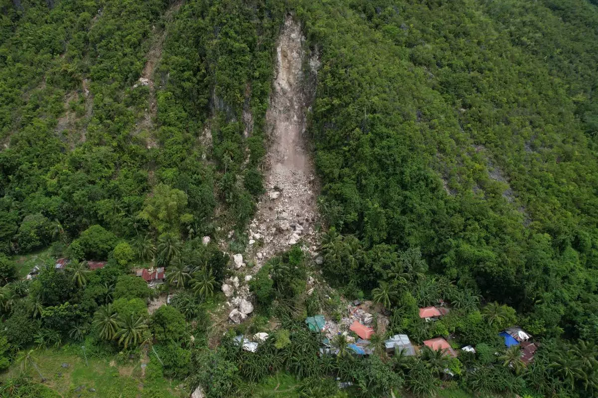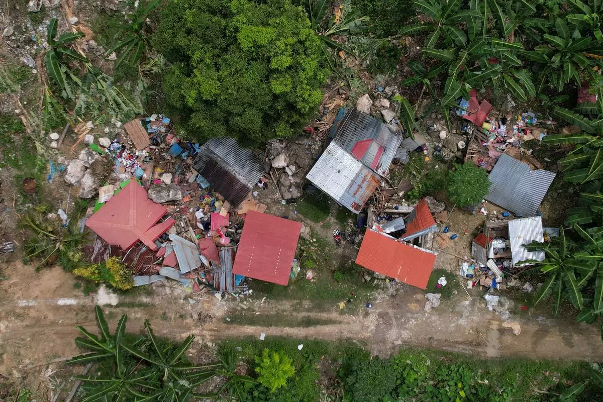 Damaged homes lie after a landslide caused by Tuesday's strong earthquake killed some people sleeping in their hillside homes, Thursday, Oct. 2, 2025, in Bogo city, Cebu Province, Central Philippines. (AP Photo/Aaron Favila)