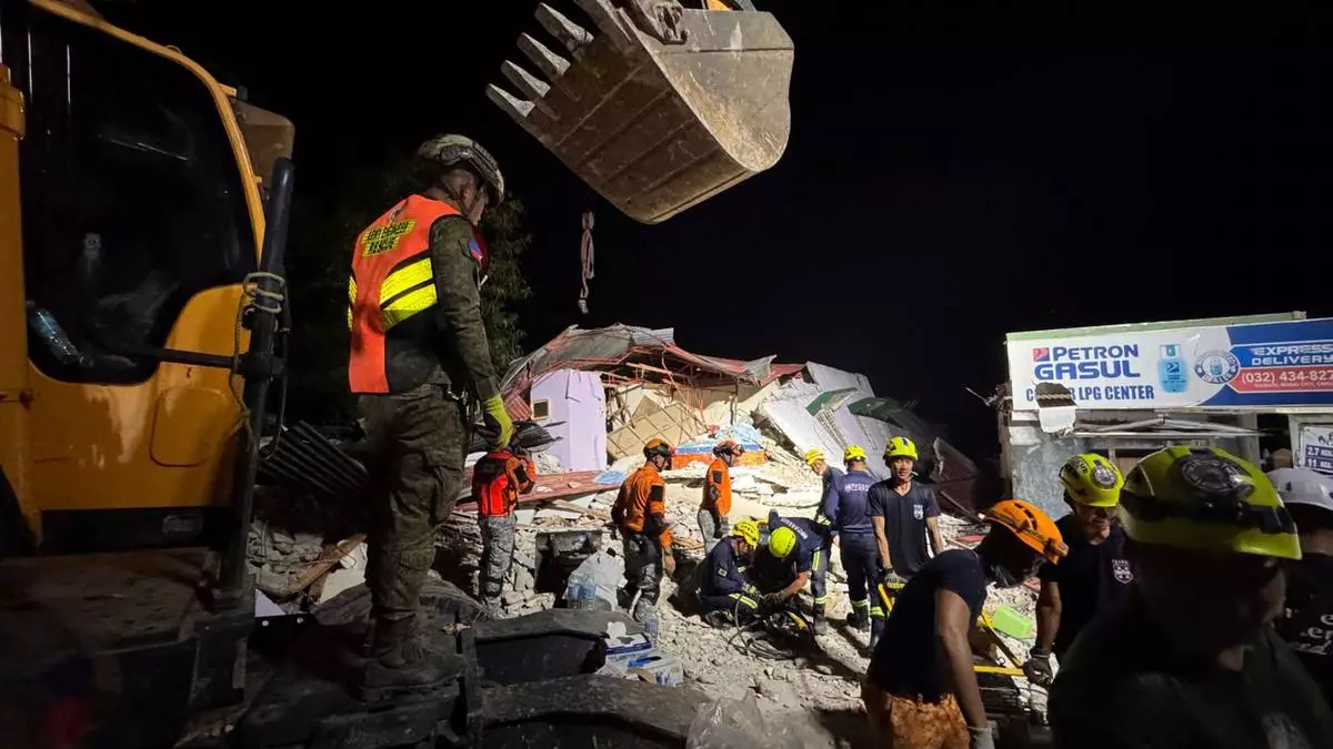 Rescuers check for survivors in the ruins of a collapsed building, Wednesday, Oct. 1, 2025 after a strong earthquake struck Bogo city, Cebu Province, Central Philippines. (AP Photo/Aaron Favila)