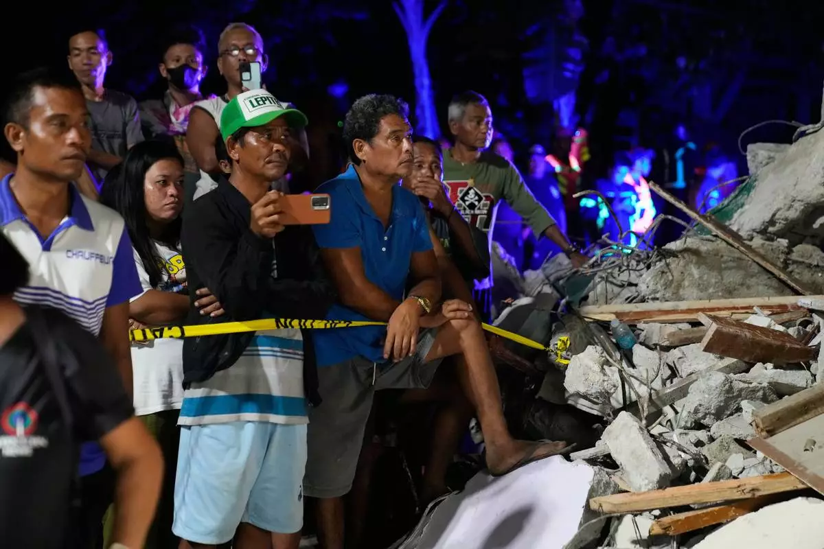 Residents look as rescuers search for survivors at a collapsed building, Wednesday, Oct. 1, 2025 after a strong earthquake struck Bogo city, Cebu Province, Central Philippines. (AP Photo/Aaron Favila)