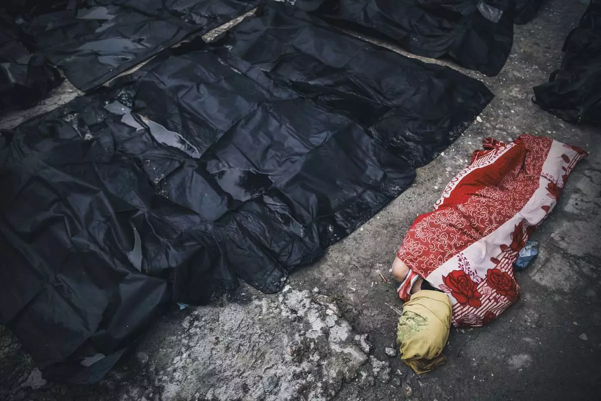 A man rests beside bodies of victims of an earthquake outside Cebu Provincial Hospital in Bogo City, Philippines, Wednesday, Oct. 1, 2025. (AP Photo/Jacqueline Hernandez)