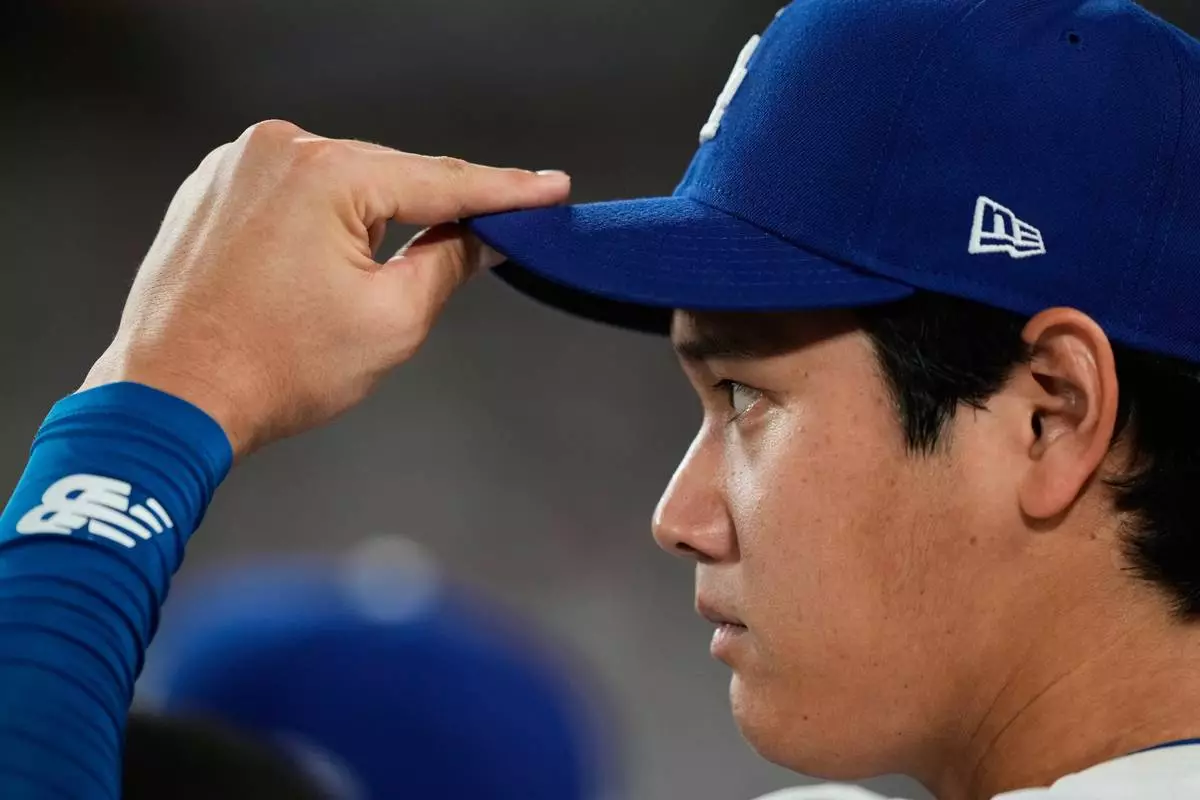 Los Angeles Dodgers' Shohei Ohtani watches from the dugout during the fifth inning in Game 1 of the National League Wild Card baseball playoff series against the Cincinnati Reds, Tuesday, Sept. 30, 2025, in Los Angeles. (AP Photo/Mark J. Terrill)