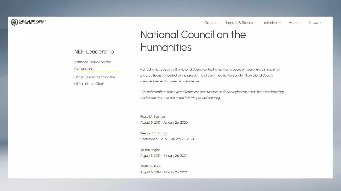 The National Council on the Humanities, a board of 26 scholars and humanities leaders appointed to six-year terms, advises the chair of the National Endowment for the Humanities on policy, grant-making, and funding matters.