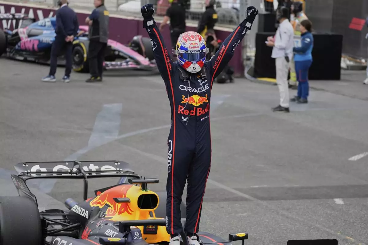 Red Bull driver Max Verstappen of the Netherlands celebrates after winning the Azerbaijan Formula One Grand Prix in Baku, Azerbaijan, Sunday, Sept. 21, 2025. (AP Photo/Darko Bandic)