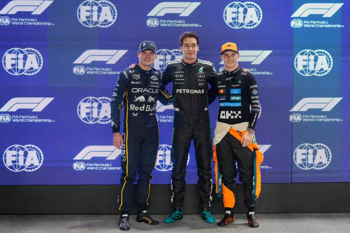 Frome the left, second-placed Red Bull driver Max Verstappen of the Netherlands, first-placed Mercedes driver George Russell of Britain and third-placed McLaren driver Lando Norris of Britain pose after the qualifying for the Singapore Formula One Grand Prix at the Marina Bay Street Circuit in Singapore, Saturday, Oct. 4, 2025. (AP Photo/Vincent Thian)