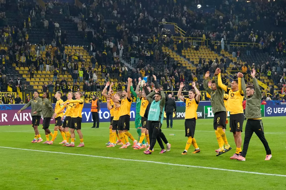 Dortmund's team players wave to fans after the Champions League opening phase soccer match between Borussia Dortmund and Athletic Club Bilbao in Dortmund, Germany, Wednesday, Oct. 1, 2025. (AP Photo/Martin Meissner)
