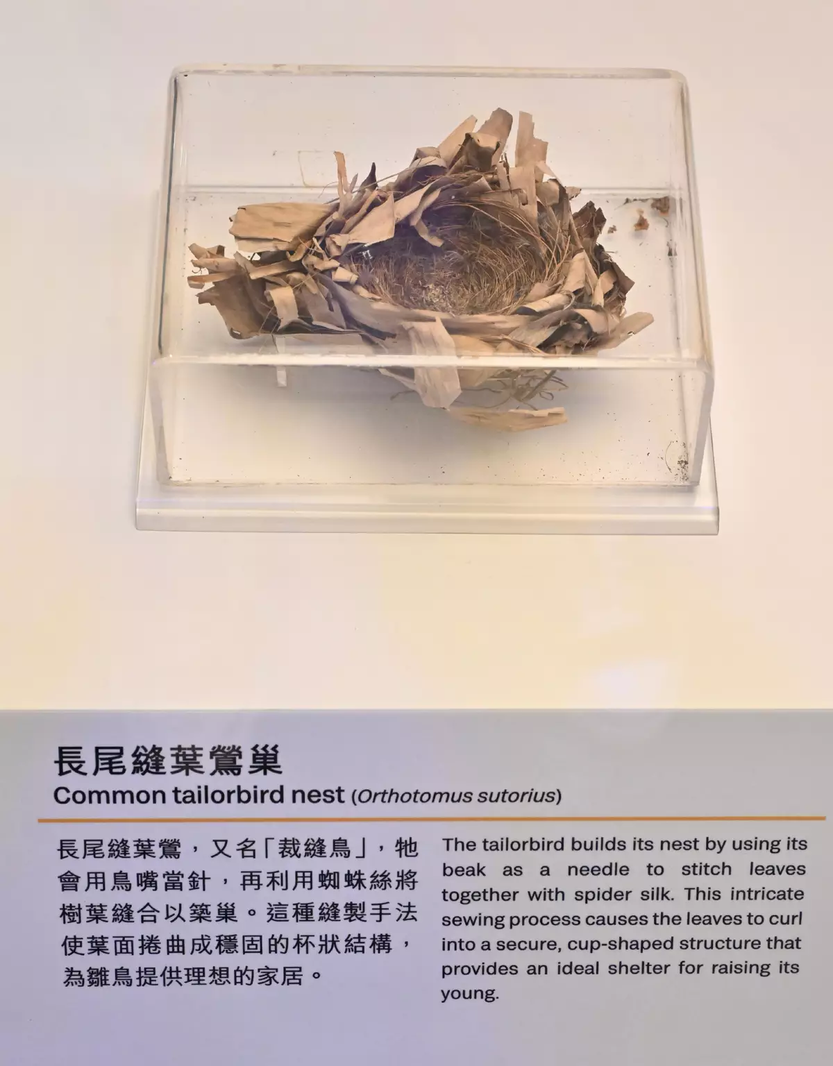 In addition, the exhibition showcases precious animal specimens, such as the Arctic fox, Japanese pipistrelle, golden lion tamarin, bigfin reef squid, as well as intricate insect and bird nests from the Hong Kong Biodiversity Museum. Visitors can closely admire the diverse strategies animals use to survive and their marvellous skills in building elaborate homes. For example, the common tailorbird is known for its unique nest-stitching ability, using its beak as a needle to stitch leaves together with spider silk to create a secure cup-shaped nest for raising its young. Meanwhile, Asian weaver ants use silk produced by their larvae as "glue" to bind leaves and construct nests. They rely on chemical and tactile signals to communicate and co-ordinate their complex nest-building activities.