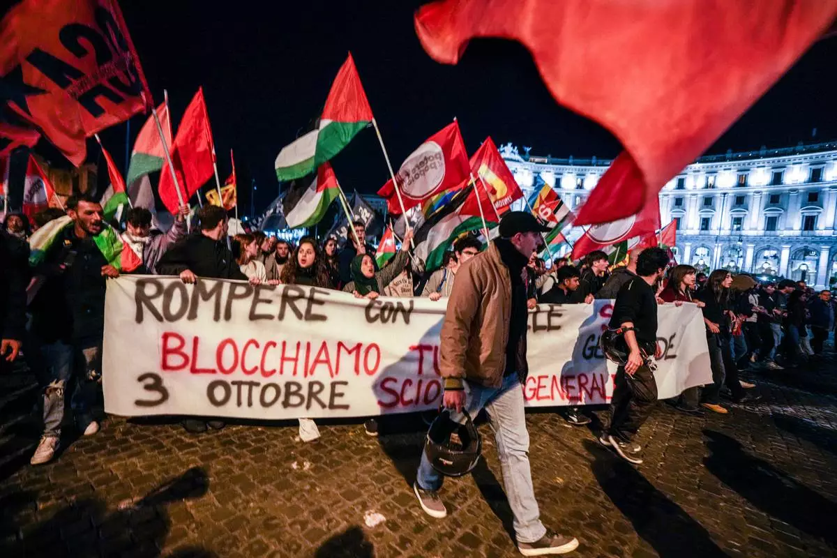 Pro-Palestinian activists march in downtown Rome late Wednesday, Oct. 1, 2025, after news that a Gaza-bound aid flotilla had been intercepted by Israeli forces in the Mediterranean Sea. (AP Photo/Andrew Medichini)