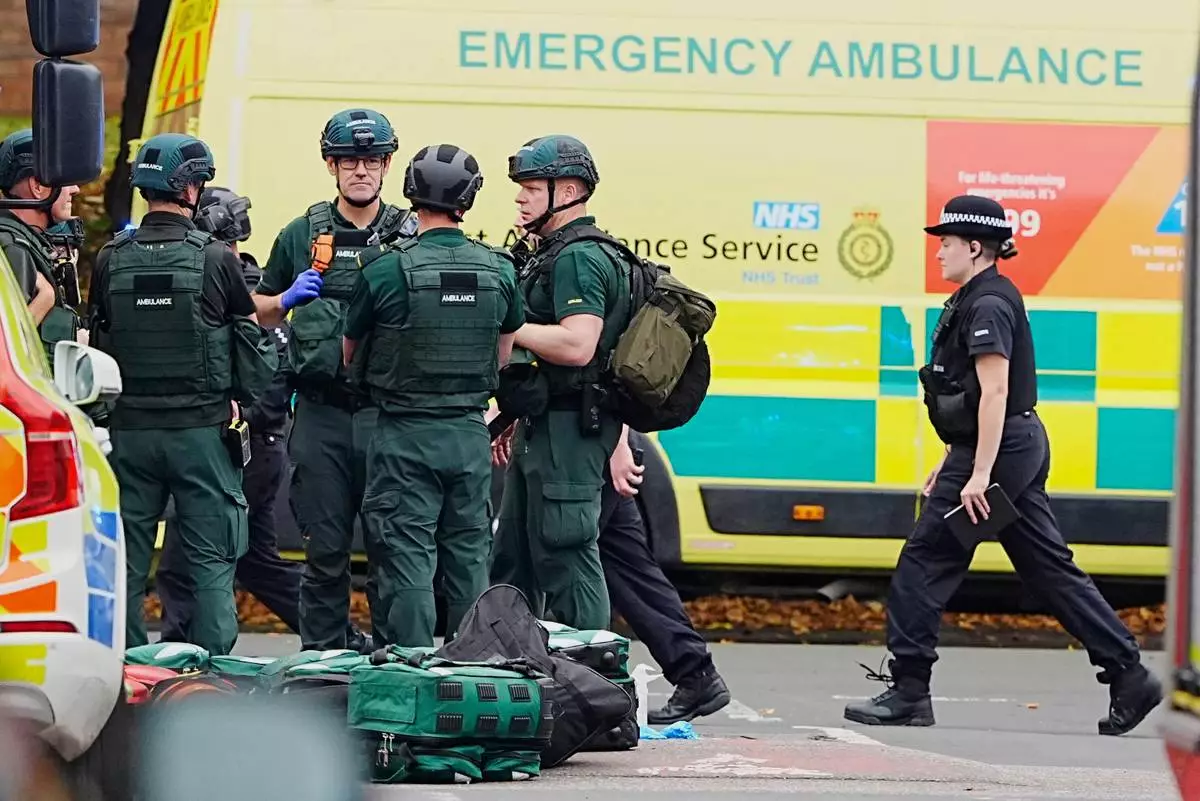 Emergency services at the scene of a stabbing incident at Heaton Park Hebrew Congregation synagogue, in Crumpsall, Manchester, England, Thursday Oct. 2, 2025. (Peter Byrne/PA via AP)