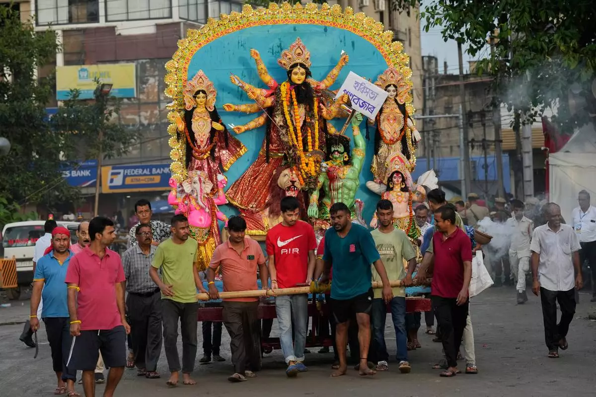 Devotees carry an idol of Hindu goddess Durga to immerse in river Brahmaputra in Guwahati, Thursday, Oct. 2, 2025. (AP Photo/Anupam Nath)