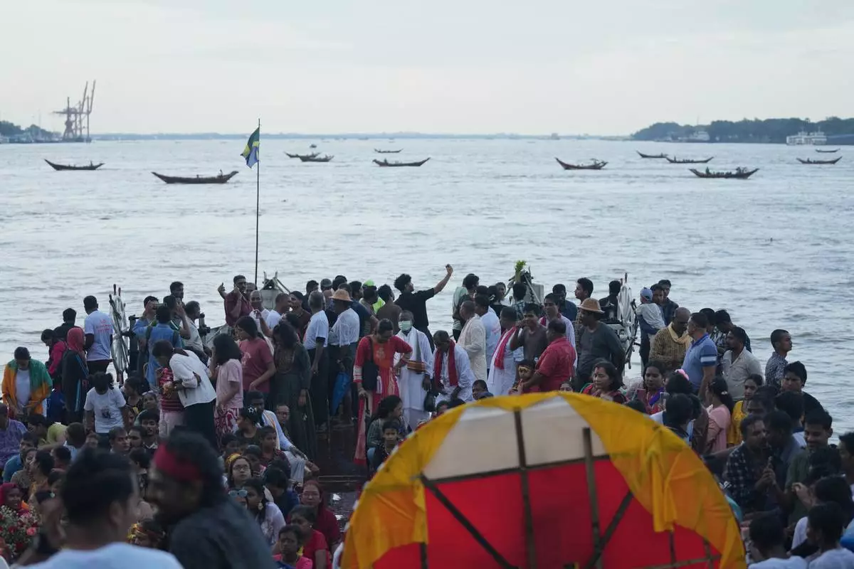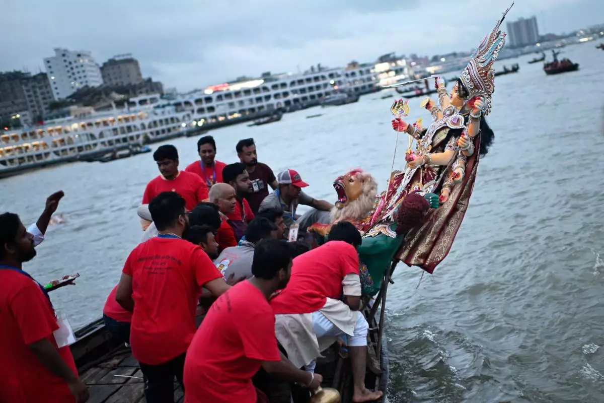 Devotees carry an idol of the Hindu goddess Durga in a boat for immersion in the Buriganga River marking the end of Durga Puja in Dhaka, Bangladesh, Thursday, Oct. 2, 2025. (AP Photo/Mahmud Hossain Opu)