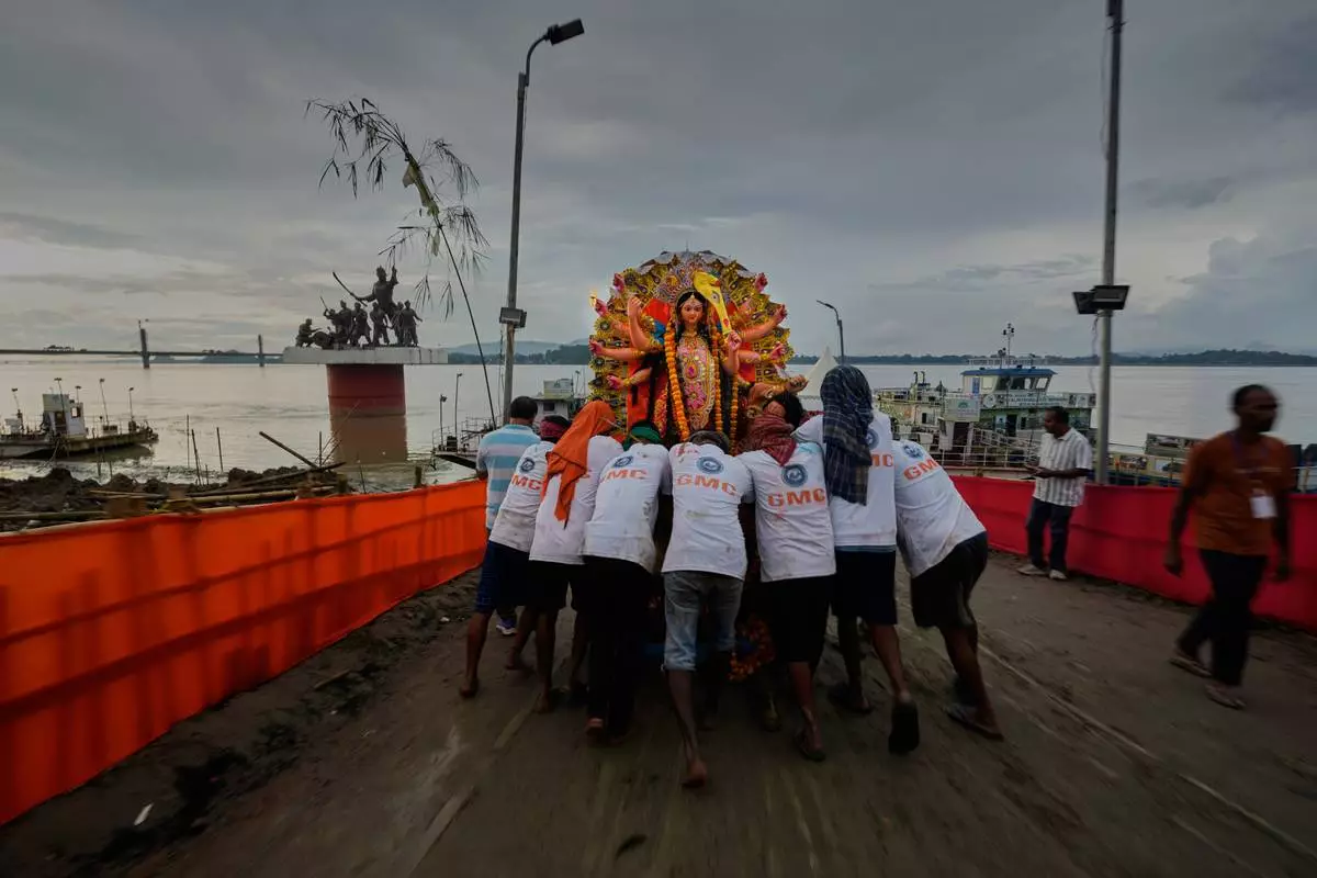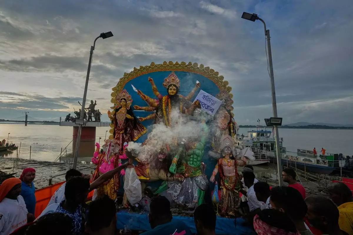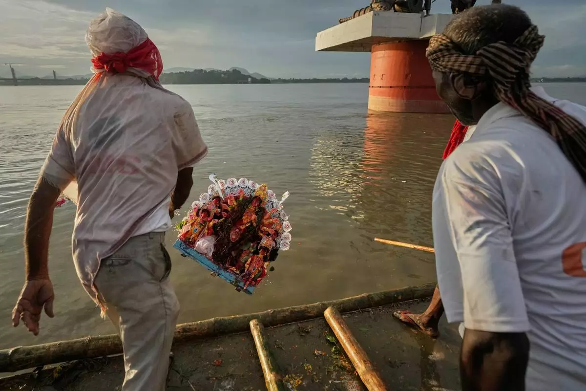 Devotees carry an idol of Hindu goddess Durga to emmers in river Brahmaputra in Guwahati, Thursday, Oct. 2, 2025. (AP Photo/Anupam Nath)
